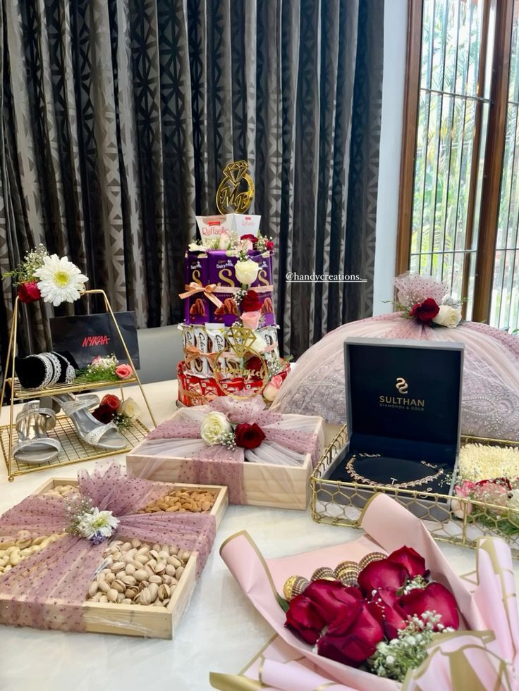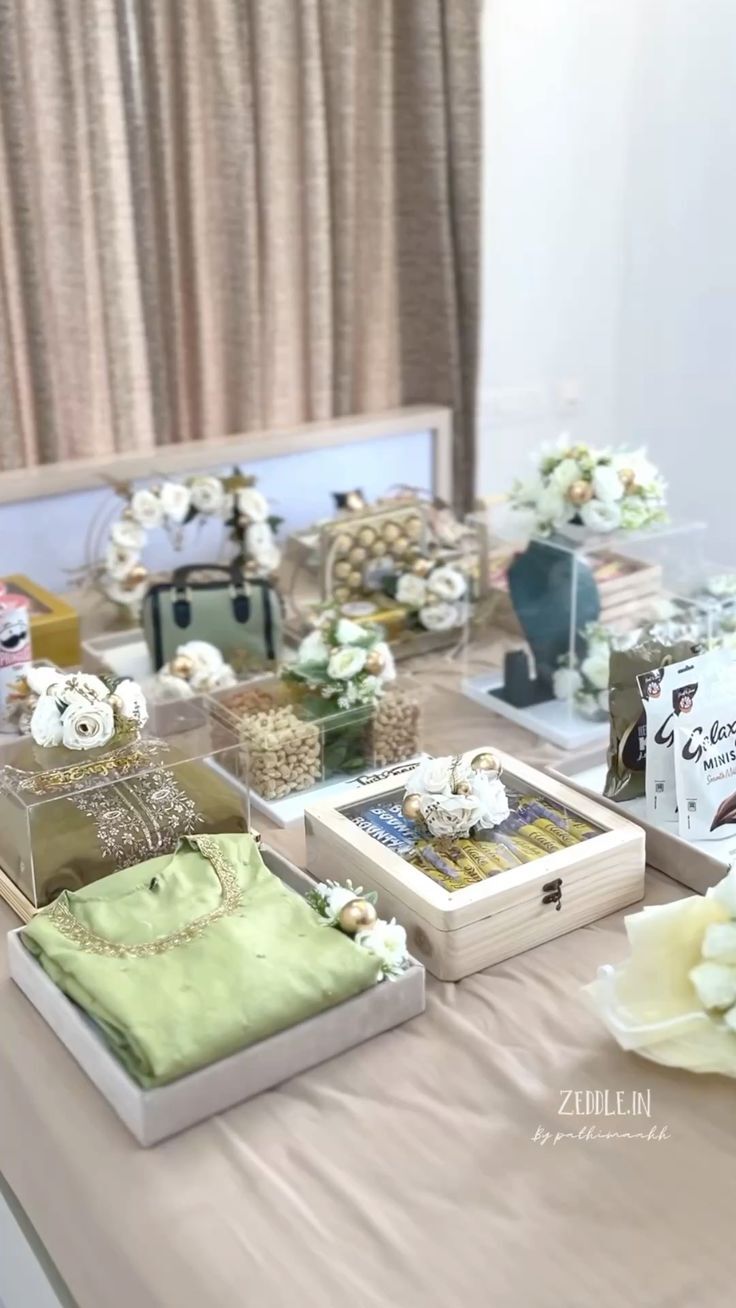 * Our wedding hampers are thoughtfully curated with sweets, dry fruits, chocolates, décor items, and personalized notes..